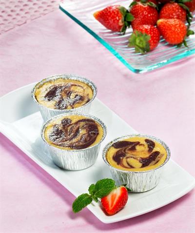 3. Ambil 250 ml adonan, tambahkan cokelat bubuk ke dalamnya dan aduk. Sisihkan. Masukkan adonan putih ke dalam cetakan mangkuk muffin. Teteskan 1 sdm adonan cokelat ke dalam setiap cetakan muffin dan siram dengan arah memutar dibagian lipatan.