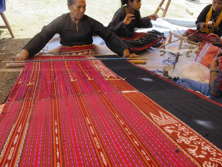 saat upacara adat. Para wanita MBD, terutama di Pulau Kisar, menenun di bawah pohon atau balai desa. Sebelumnya, hasil tenunan ini belum dijual,melainkan hanya dipakai sendiri. Berkat program yangdiselenggarakan semenjak 2001, kini mereka memiliki Simpan Pinjam Kelompok Perempuan, yang bertujuan memajukan usaha perempuan, salah satunya lewat menenun. Kini mereka bisa menenun berkelompok di setiap desa untuk mengerjakan pesanan dari luar.