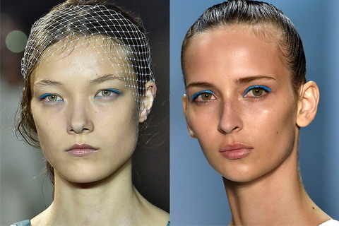 Sentuhan biru bisa Anda aplikasikan sebagai eyeliner atau aksen di ujung dalam mata. Pilih biru terang (runway: Marc Jacobs, Tods).
