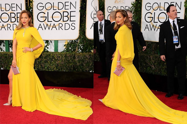 J.Lo terlihat waw dalam gaun dengan cape dari Giambattista Valli Haute Couture. Menurut J.Lo, Warna gaun dengan aksen high slit ini bisa dibilang kuning, mustard-y, atau marigold.