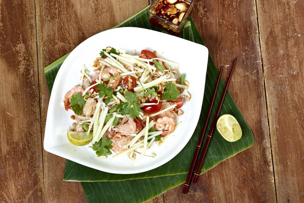 Green Papaya Salad: Bahan pepaya hijau mentah, udang, jeruk Bali, dan taburan kacang mede bisa Anda olah menjadi salad segar ini. Bisa juga jadi appetizer, seporsinya 184 kalori saja.