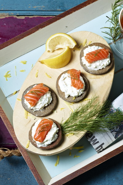 Blinis Keju Salmon: Pas untuk penggemar salmon sashimi atau smoke salmon, dengan dressing minyak zaitun. Meski sebuahnya hanya 76 kalori, hati-hati kalau Anda tambah dan tambah lagi....