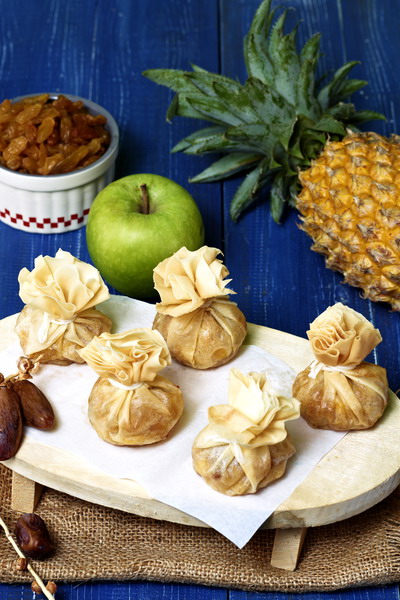 Pangsit Buah Rempah: Rasanya renyah tapi tak biasa, karena kulit pangsit Anda isi potongan pisang ambon, mangga, apel granny smith, kurma kering, hingga daging nanas. Dengan aroma kayu manis, sebuahnya cukup mengenyangkan, 274 kalori.