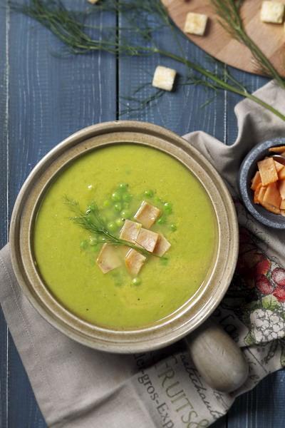 2. Buang daun salam, tambahkan kacang polong matang, haluskan sup dalam panci. Tambahkan merica dan garam.
