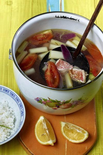 2. Panaskan minyak, tumis bawang bombai dan bawang putih hingga harum. Tuang kaldu ikan, aduk hingga rata.