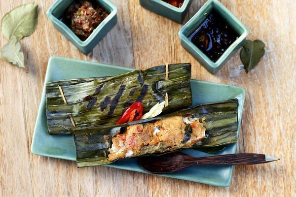 2. Ambil 1 lembar daun pisang, isi dengan ikan berbumbu, tomat, cabai, daun kemangi, dan daun jeruk, ratakan. Bungkus ikan dan semat lidi pada kedua ujung daun pisang.