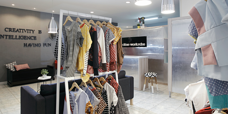 Pada 2009, Oline membangun Oline Workrobe. Mulai dengan dua karyawan saja. Jenis pakaian ini dipilihnya denga alasan yang sederhana. Saat masih ngantor, ia sering merasa kesulitan mencari baju kerja yang agak nyetrik tapi tetap representable. Satu potong pakaian karya Oline dapat terdiri dari delapan jenis bahan dan warna. Bentuknya pun bermacam-macam. Motif dan warna saling bertabrakan namun bisa menciptakan kesatuan yang harmonis. Saya mengira-ngira mungkin wanita yang akrab dipanggil Oline ini seperti sedang bermain puzzle saat mencipta. “Dulu semasa sekolah dan bekerja, saya sering berinteraksi dengan bentuk-bentuk geometris. Sekarang coba saya tuangkan ke sesuatu yang wearable,” Oline menjelaskan. Walau demikian, ia memiliki kekaguman pada perancang-perancang yang dapat menghasilkan kreasi outstanding dengan satu warna saja. “Mungkin otak gue yang nggak sampe”, kelakarnya.