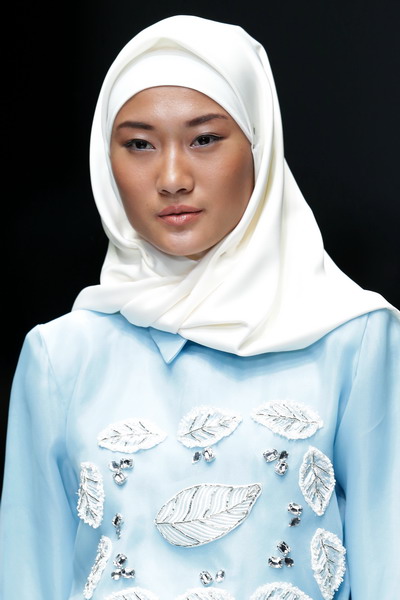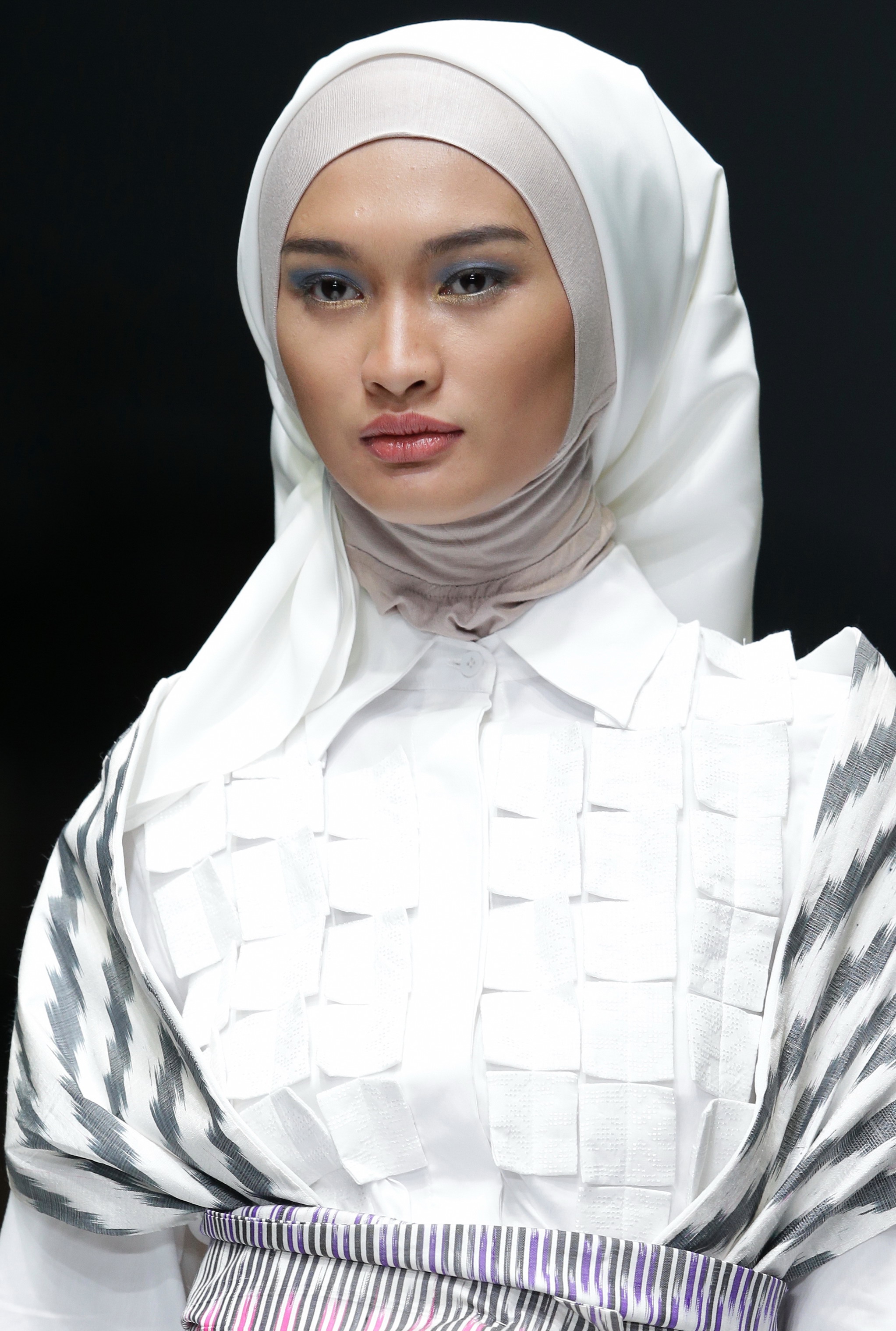 Tetap natural, namun sedikit aksen pada bibir (dengan lipgloss) dan mata (alis lebih intens) untuk menyeimbangkan bentuk kerudung yang simpel (busana: Zashi).